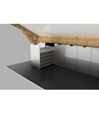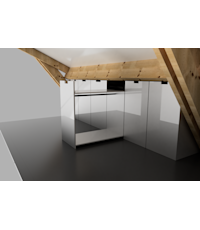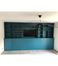 Egger U 1400 "Bois de Grange" avec module d'angle tournant sur 360° sur roulements a billes. Tiroirs "double sens" Monsieur/Madame sur glissière, Éclairage ruban LED blanc chaud 3000K et spots led directionnels 3500K.