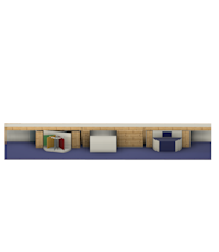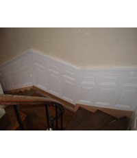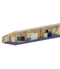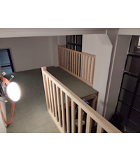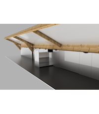 Stand de présentation avec cloison courbe R° 1,95m, développé 3,06 ml, hauteur 2,3m. Structure CP 25, support Cintrable 7mm double peau, Stratifié sur place, strat 8/10 Egger Kaolin.